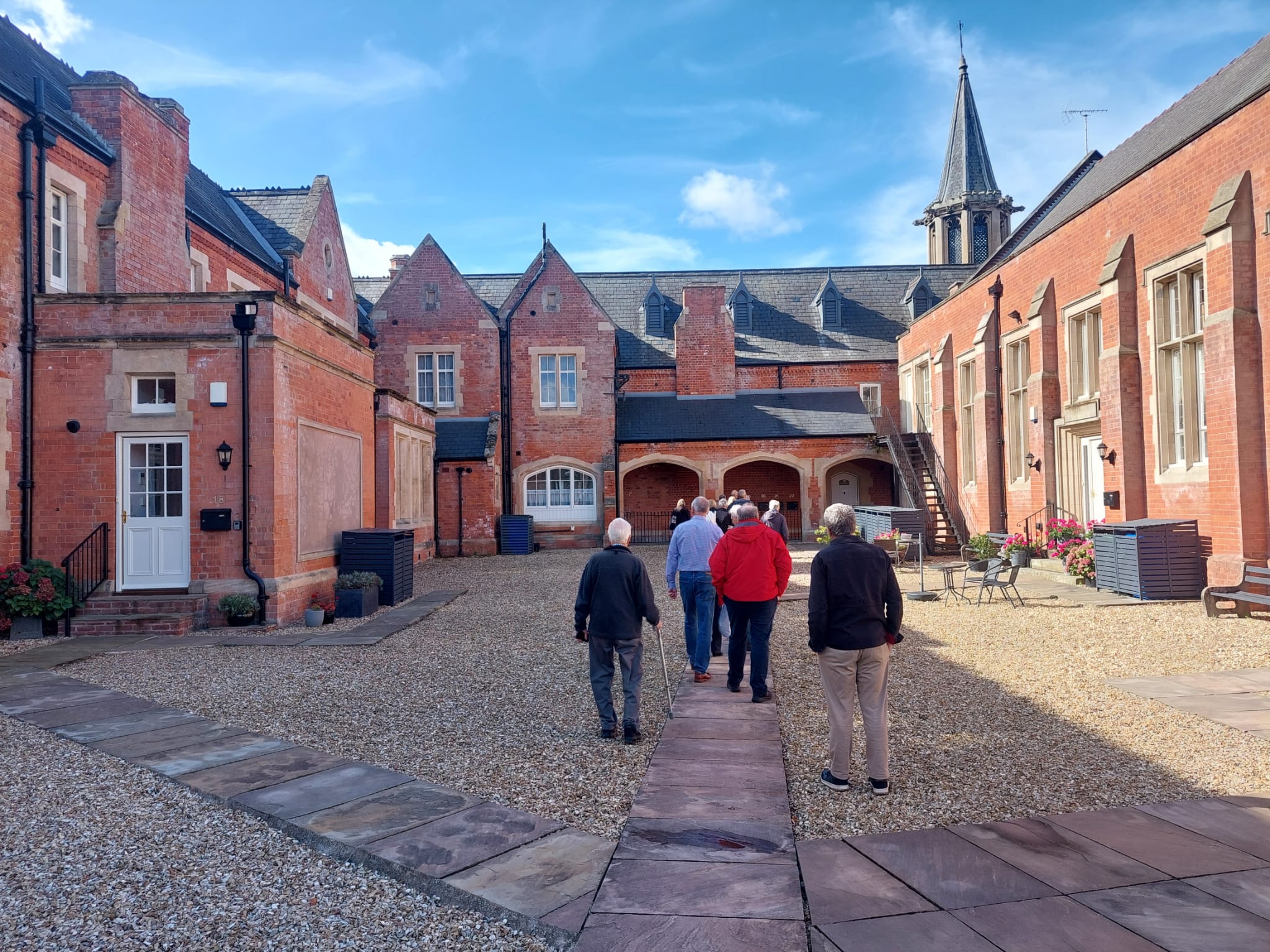 In 2025, the PE store (right); reprographics room / tuck shop window and the spiral staircase up to the staff room just left beyond the cloister. At the top of those stairs also was a small room used for detentions where, during one of my few detentions for late homework I wrote an essay on "the importance of punctuation", rather than "punctuality" which I was asked for. Fool! On the right the fire escape access behind the hall, to, (apparently) the easiest way onto the rooves... [Ged 2025-10-03 06:26:26] |